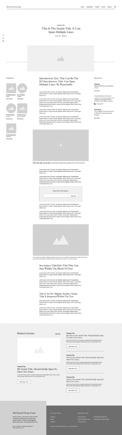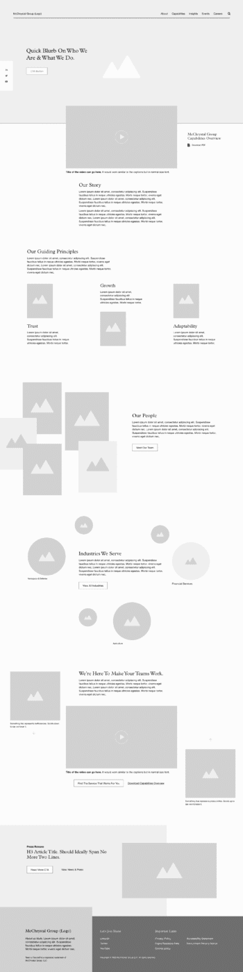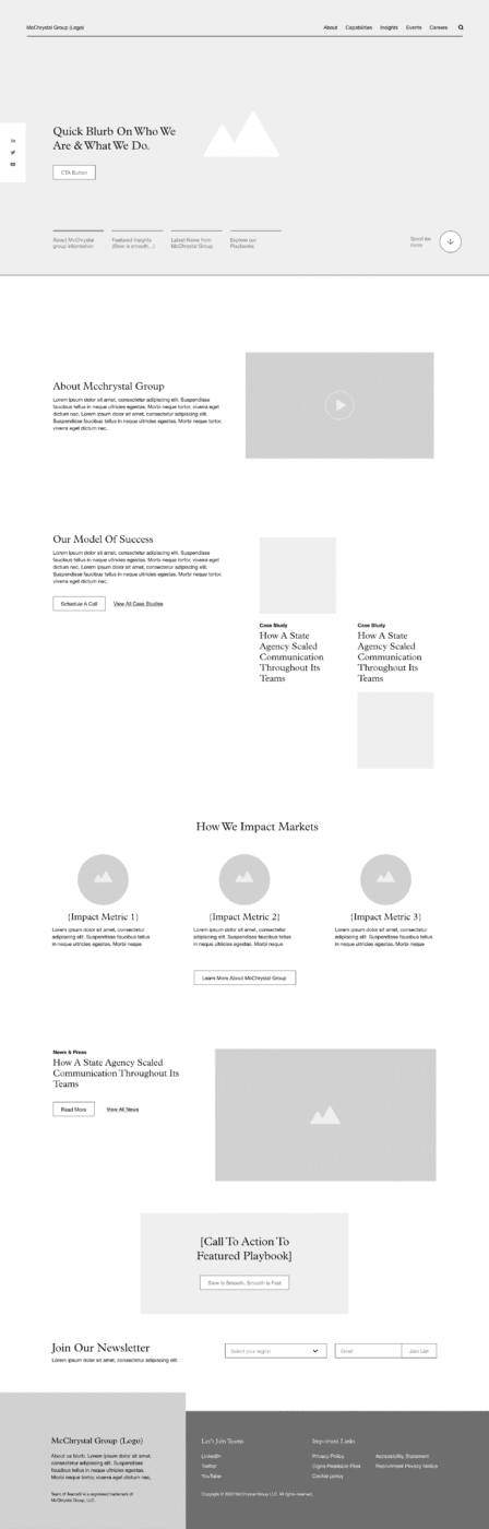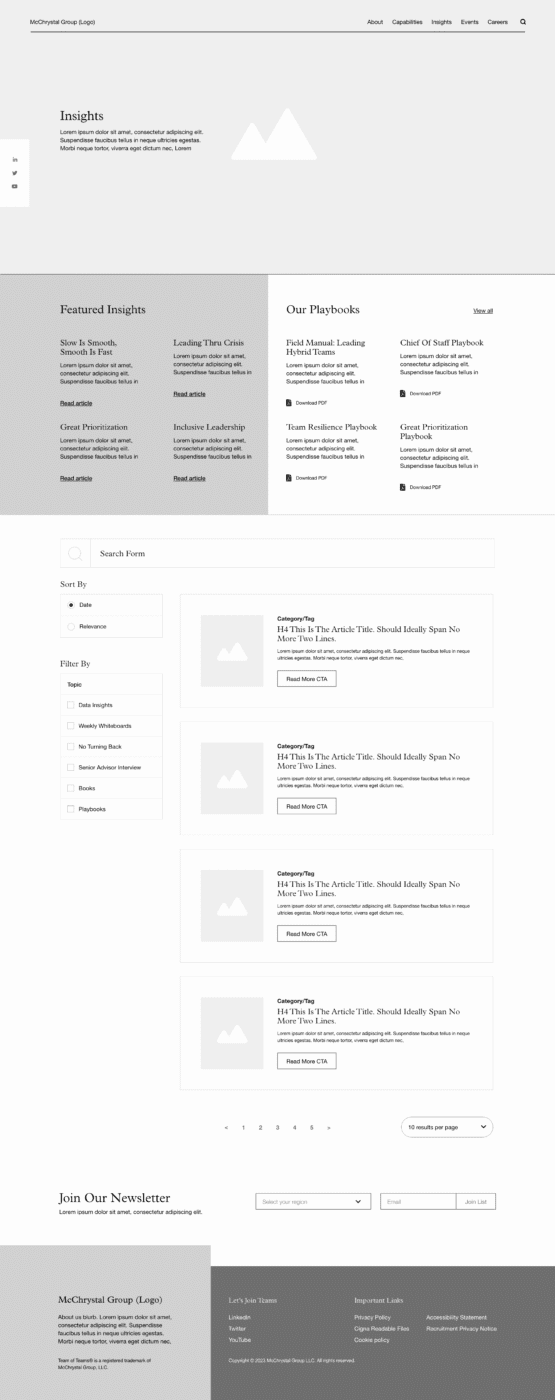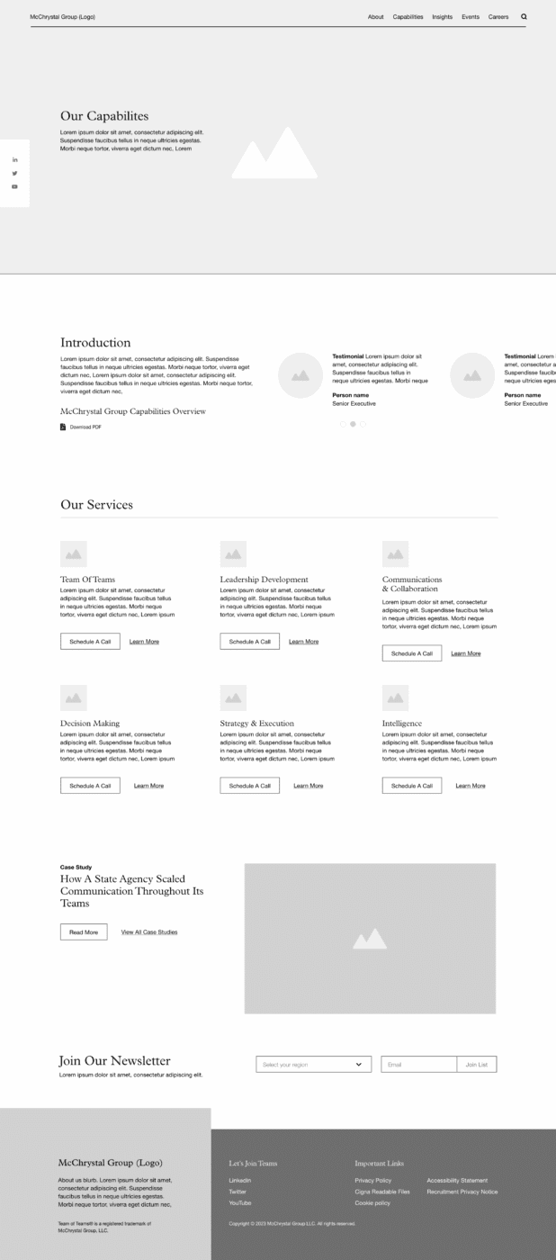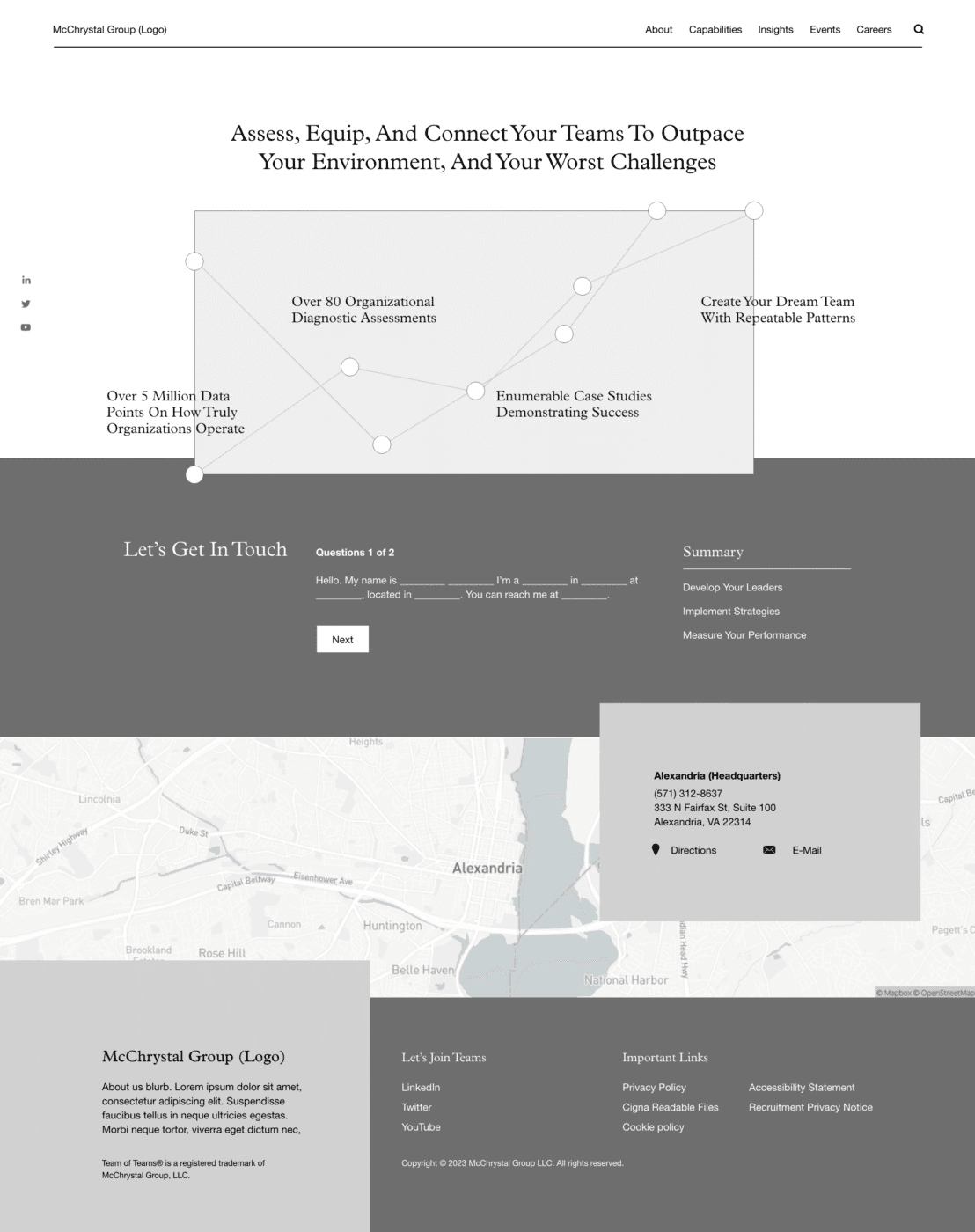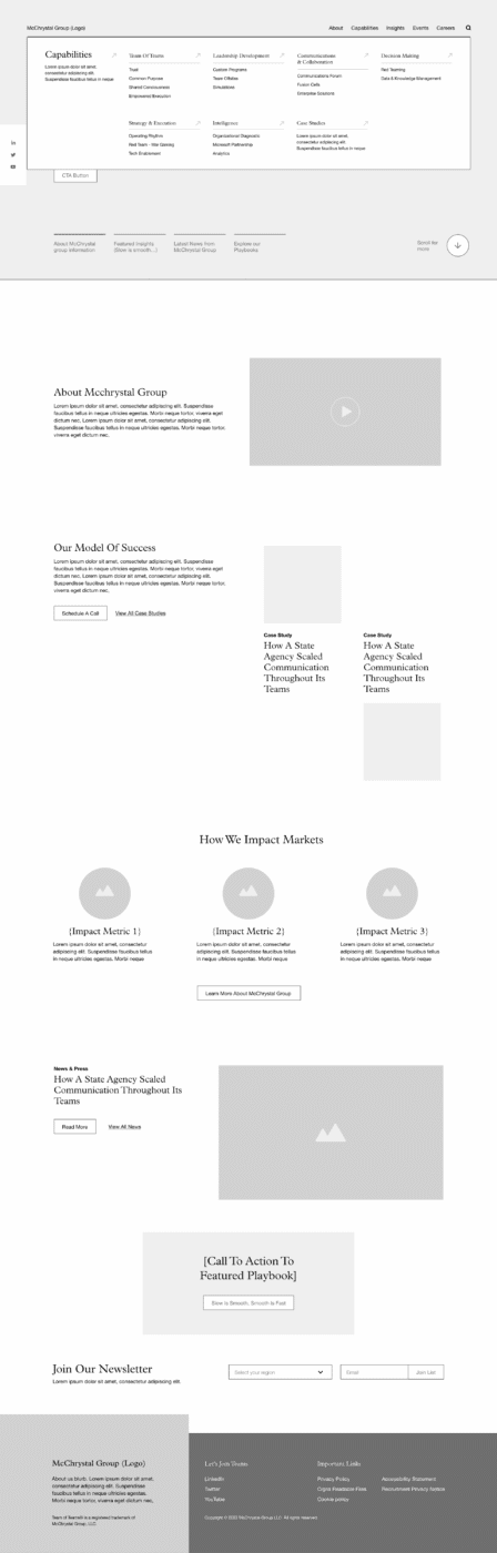 While some elements of the information architecture and wireframes evolved due to feasibility constraints and user feedback, the core concepts were successfully implemented and are now live on the site. Key improvements included the introduction of a mega-menu to efficiently display large volumes of content, preserving clear page hierarchies, and strategically placing calls-to-action to guide user behavior. The visual design team took these foundations further, enhancing the experience by embracing and expressing McChrystal Group’s bold, “outlaw” brand identity throughout the site.