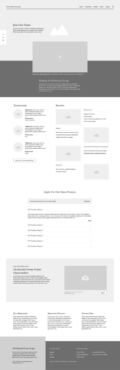 Once the information architecture was finalized, I moved into wireframing. During the discovery phase, we included a questionnaire for key stakeholders, asking, “What adjectives come to mind when thinking about MG?” One response stood out: “Outlaw.” This, along with feedback highlighting MG’s adaptable, boundary-pushing culture, became a central theme in our design approach. With those insights in mind, I created a rough wireframe that offered structural guidance while leaving room for the visual designers to explore bold, unconventional layouts—encouraging them to reflect the brand’s personality and appetite for innovation.