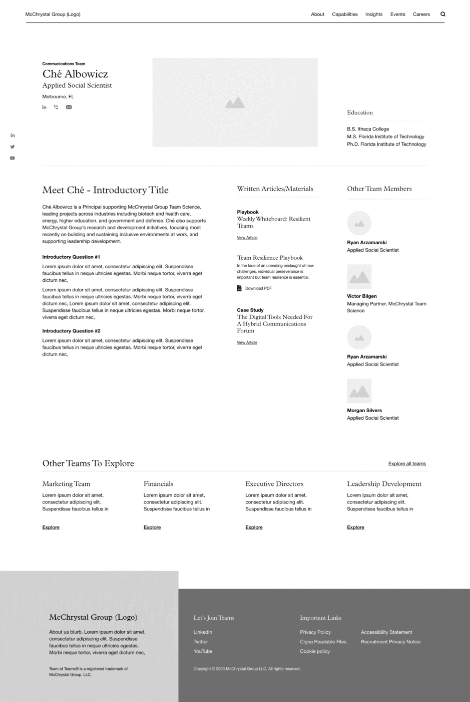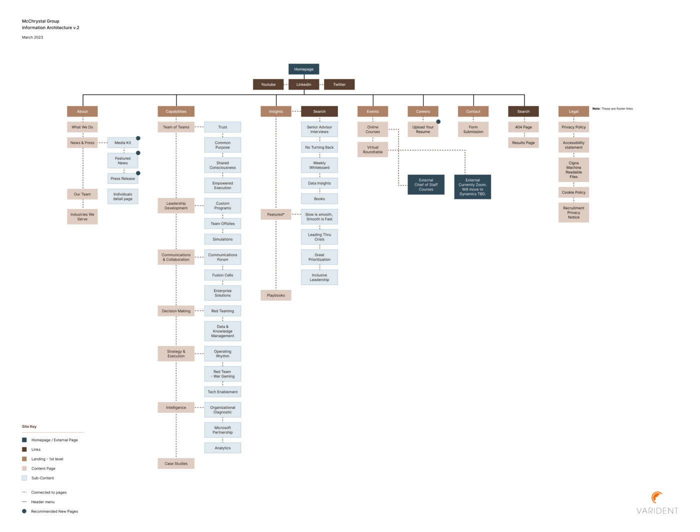 On January 2023, I partnered with Varident (now Corner Pxl) to work on an information architecture for McChrystal group—a leading firm dedicated on improving your teams’ outcome in the professional market. The aim of this new architecture and wireframing was to discover how to improve their services in the market and make a slight separation from its founder who would be retiring in the coming years. The idea was focused on highlighting the features of the consulting agency over the founders personality.